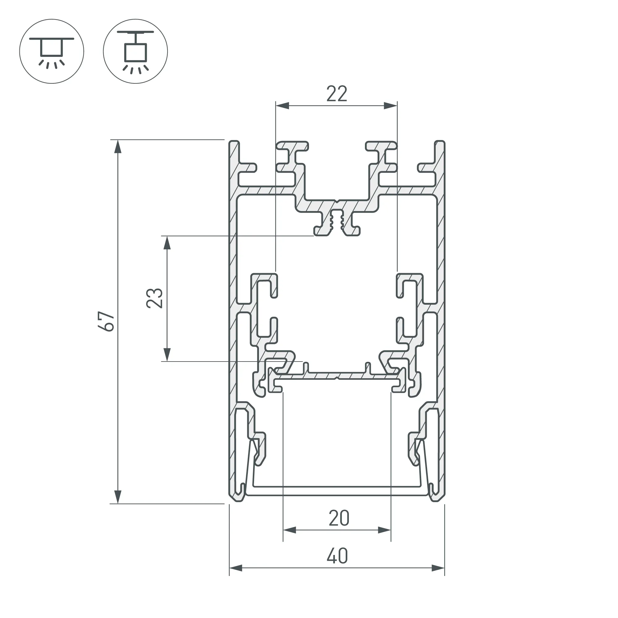 Комплект с экраном. Алюминиевый анодированный профиль для светодиодных лент и линеек. Габаритные размеры (L×W×H): 2500x40x67 мм. В комплекте профиль, основание для ленты, PC матовый экран, фиксаторы основания 4шт, винты. Отсек для БП 22х22мм (±1 мм). Ширина площадки для ленты 20 мм. Светопропускание экрана 85%. Аксессуары приобретаются отдельно.