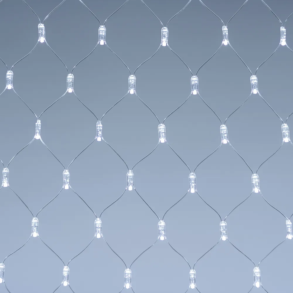 Светодиодная сеть Classic. 2000x1500 (длина 2000 мм, высота 1500 мм). Цвет свечения БЕЛЫЙ (6000 К). 288 светодиодов размером 7 мм со статическим и 8 динамическими эффектами свечения с резким световым рисунком (прозрачная вогнутая линза). Провод прозрачный, ПВХ. Питание 230 В, Мощность 18 Вт,защита IP65, применение в помещении и на улице под навесом Аксессуары для подключения и выбора режима свечения в комплекте.