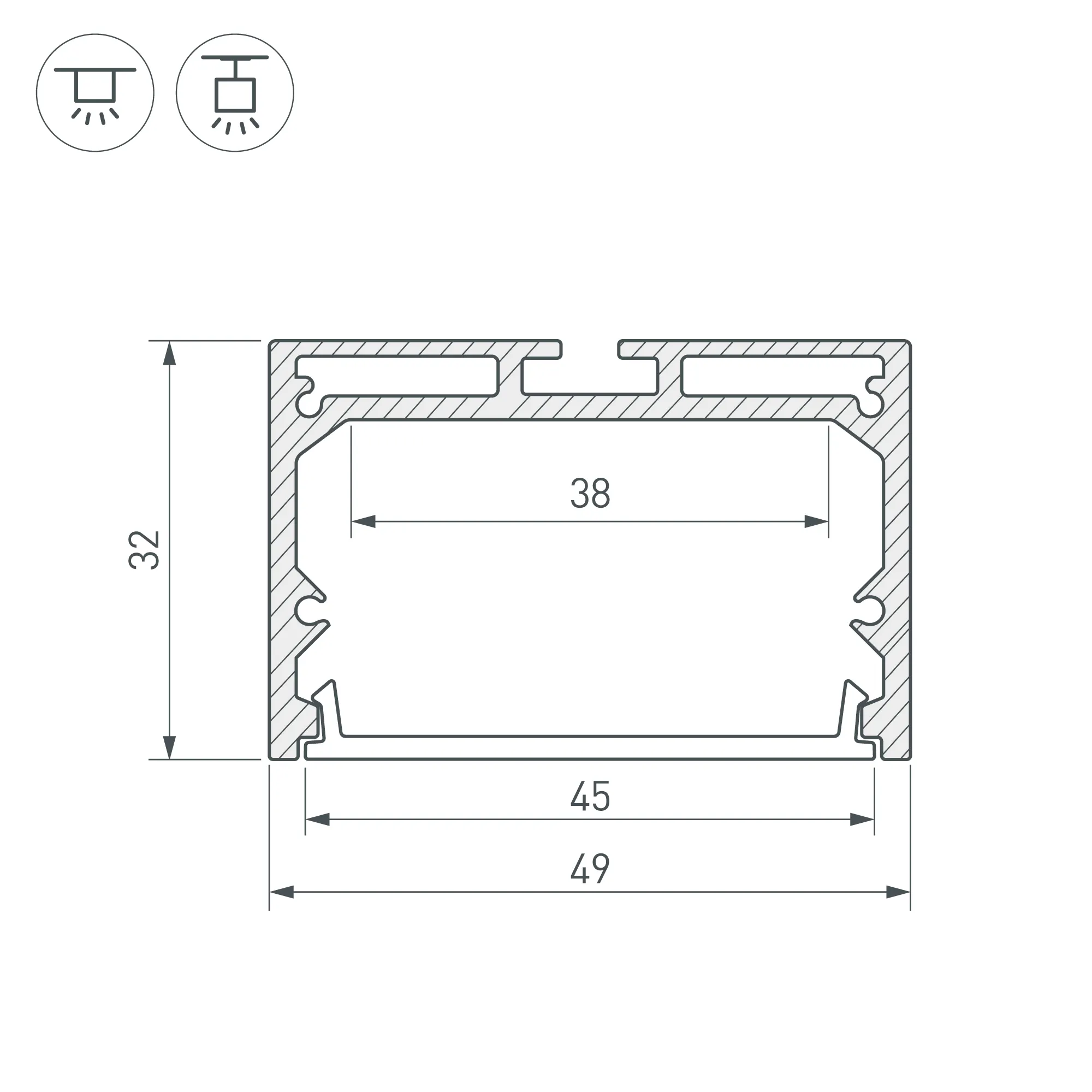 Алюминиевый профиль для светодиодных лент и линеек. Цвет - черный RAL9005 (порошковая окраска).Габаритные размеры (L×W×H): 3000x49x32 мм. Ширина площадки для ленты 38 мм. Экраны, заглушки и другие аксессуары приобретаются отдельно. Цена за 1 метр.