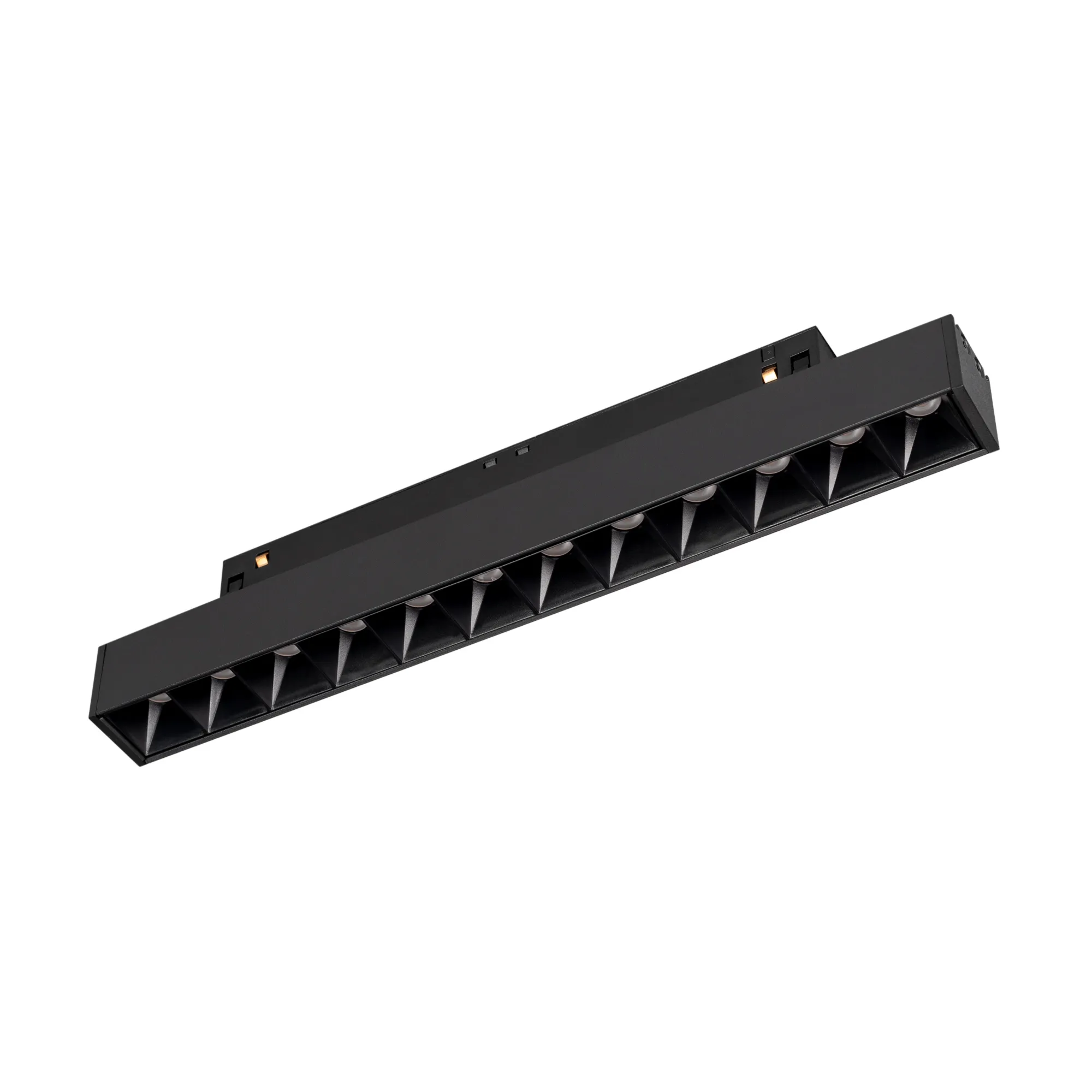 Светильник для магнитных треков MAG-FLEX. Мощность 8 Вт, св. поток 440 лм, 55 лм/Вт, теплый 3000 K, CRI>90, угол24°, напряжение питания 48 В. Черный прямоугольный корпус из металл, экран поликарбонат, степень защиты IP20. Размер: длина 235 мм, ширина 22 мм, высота 42 мм. Монтаж на трек MAG-FLEX. Пульсация <1%.