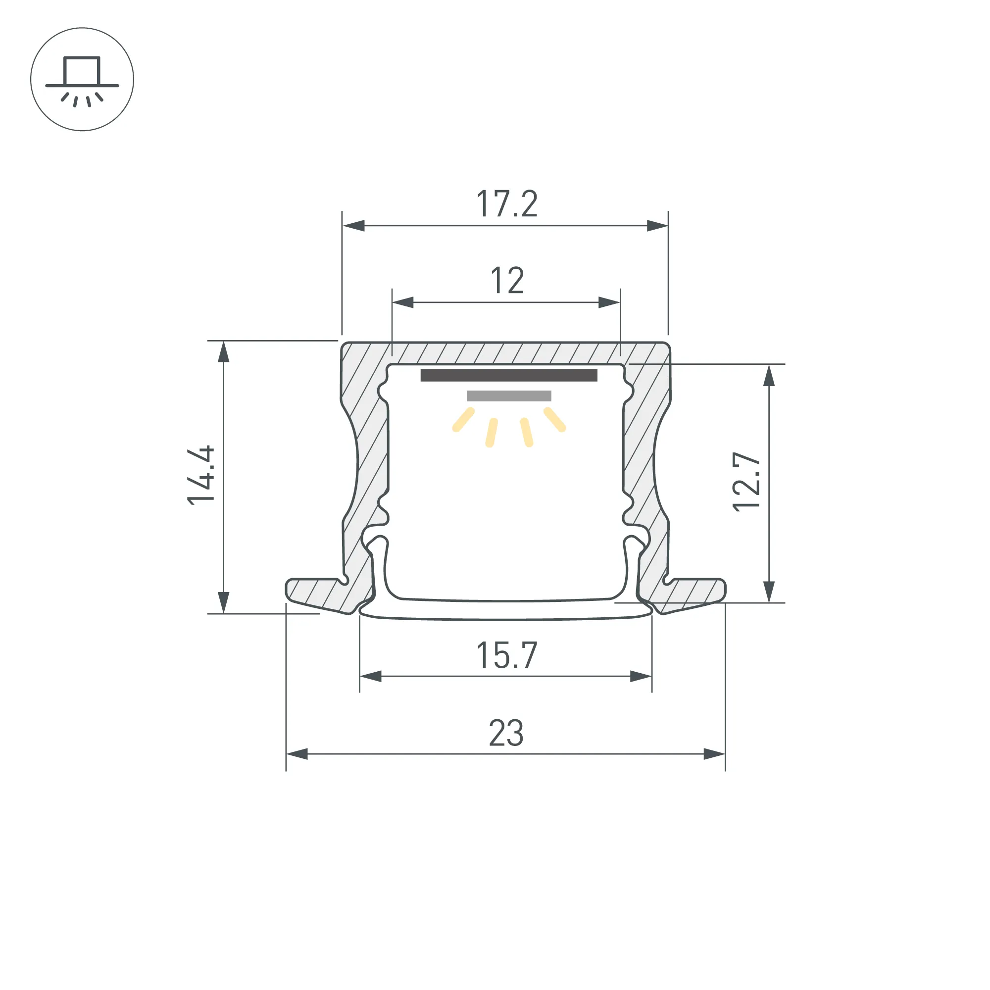 Алюминиевый анодированный встраиваемый профиль для светодиодных лент и линеек. Габаритные размеры (L×W×H): 2000x23x14,4 мм. Паз для установки 17 мм. Ширина площадки для ленты 12 мм. Экраны, заглушки и другие аксессуары приобретаются отдельно. Цена за 1 метр.