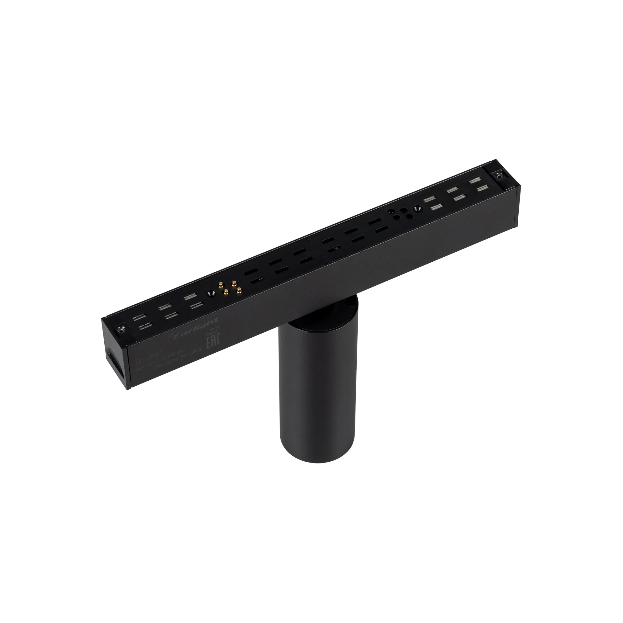 Светильник поворотный для магнитных треков шириной 25 мм с управлением DALI, мощность 9 Вт. Цвет свечения ДНЕВНОЙ 4000K, световой поток 630 лм, угол 30°, CRI>90. Корпус прямоугольный, металл, цвет черный, IP20. Размеры LxWxH 100x35x90 мм. Входное напряжение DC24V, мощность 9 Вт. Драйвер AС230V/DC24V поставляется отдельно. Диаметр светоизлучающего модуля 35 мм.