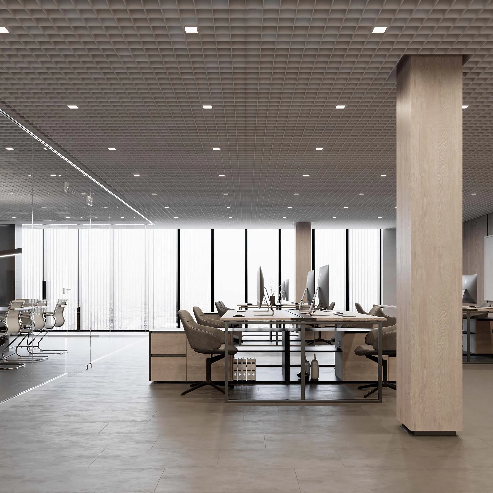 Встраиваемый светильник даунлайт для установки в потолки Грильято с размером ячейки 100х100 мм и высотой направляющих 30, 40 или 50 мм. Мощность 12 Вт, св. поток 1207 лм, 103 лм/Вт, тёплый 3000 K, CRI>90, угол 90°, напряжение питания 230 В. Белый квадратный корпус из алюминия, степень защиты IP40. Размер: длина 90 мм, ширина 90 мм, высота 40 мм. Монтаж встраиваемый, установочное отверстие: длина 90 мм, ширина 90 мм. Драйвер 24-42 В, 300 мА, пульсация <2%.