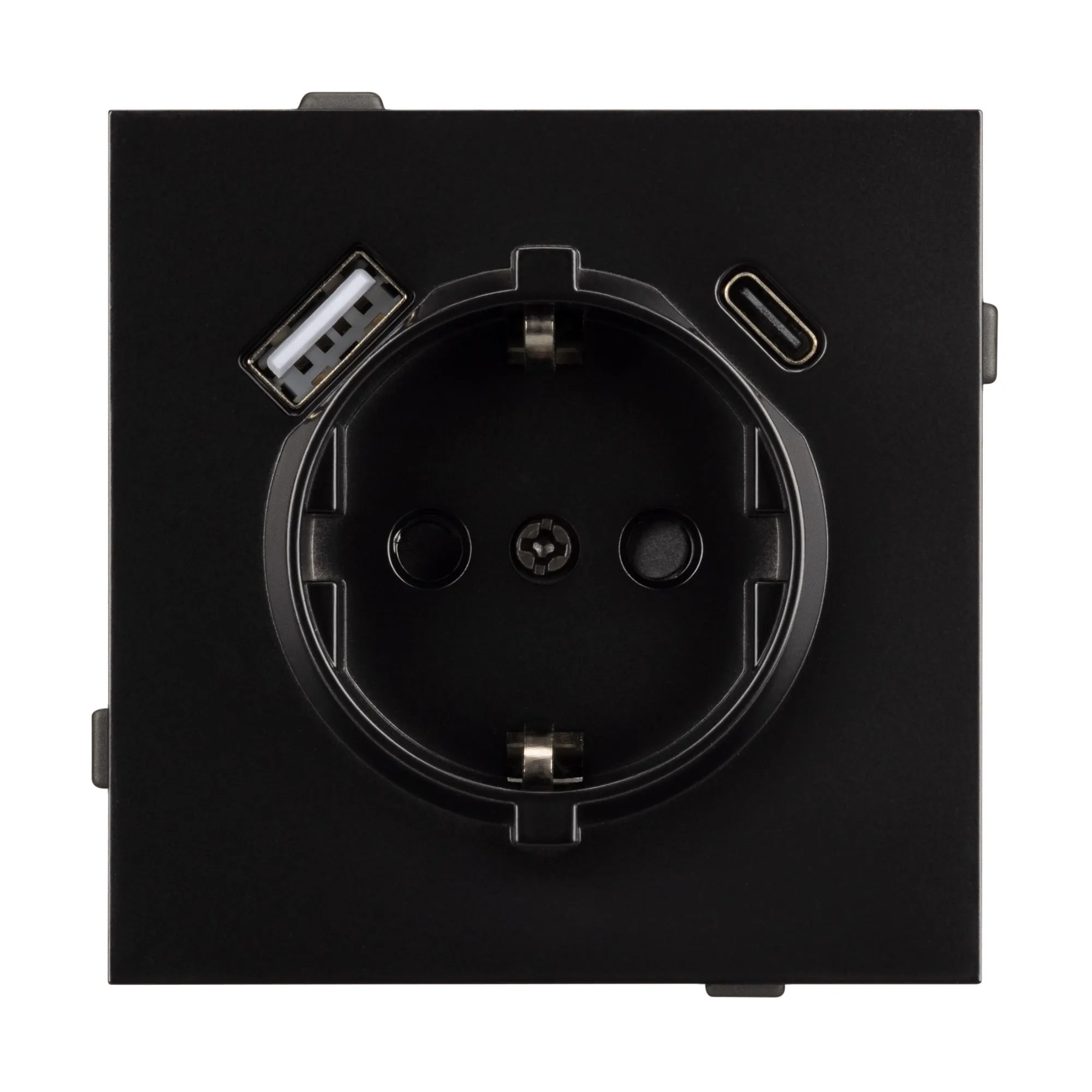 Механизм розетки с заземлением 1 пост 2 USB Type A+C порта. Цвет - черный. Без фронтальной рамки. Уровень пылевлагозащиты IP20. Розетка устанавливается в стандартный подрозетник круглого сечения диаметром 60мм.